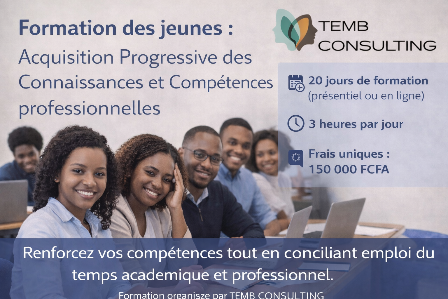 Dans le cadre de son engagement pour le développement des compétences des jeunes, TEMB CONSULTING lance une formation intensive axée sur l’acquisition progressive des connaissances et compétences, tout en restant compatible avec les contraintes professionnelles et académiques des participants. Cette formation pratique et structurée vise à renforcer l’employabilité et l’autonomie des jeunes dans un environnement en constante évolution.